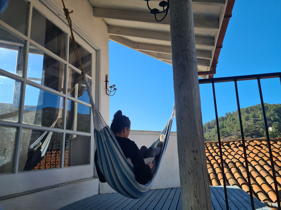 It has 2 cosy bedrooms, a comfortable living room with a fireplace, a dining area, and a fully equipped kitchen. Personally, what I enjoyed the most, is the beautiful back porch. While the sun rays warm you up in the mornings, it’s perfect to sit and enjoy your breakfast or read a book on the hammock or the beautiful rocking chair, while enjoying the panoramic views of Potamitissa village.
